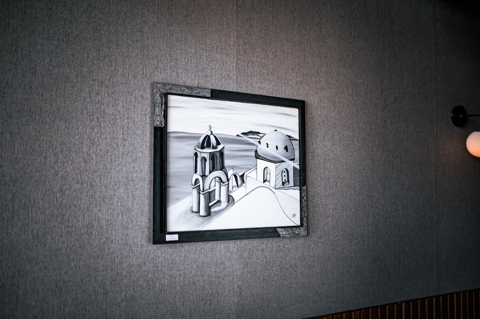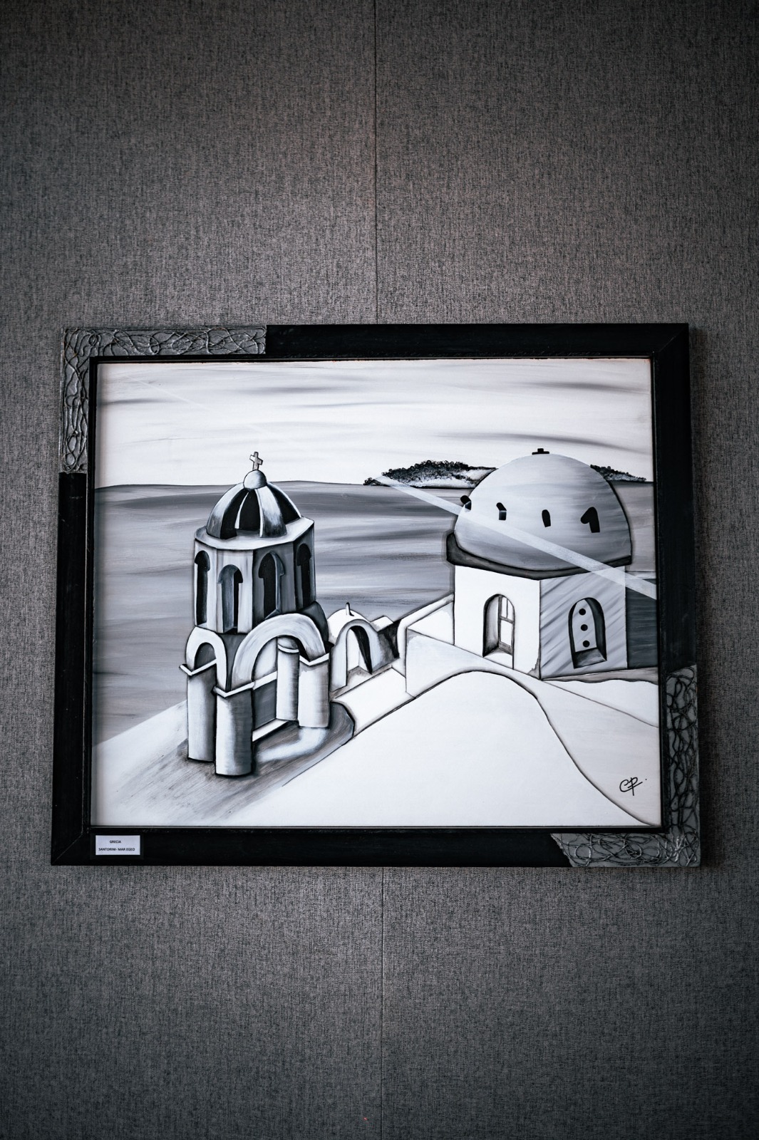 Tal y como si estuviéramos sobrevolando la mágica Isla de Santorini en Grecia, podemos apreciar en este cuadro las construcciones blancas características del lugar, con vista al mar Egeo. Las delicias que el mar nos regala se pueden apreciar en la variedad que ofrecen nuestros distintos platos. Esta obra se encuentra pintada con acrílicos de la escala que nos lleva del color blanco al negro, en base de madera y en dimensiones de 80×60 cms.